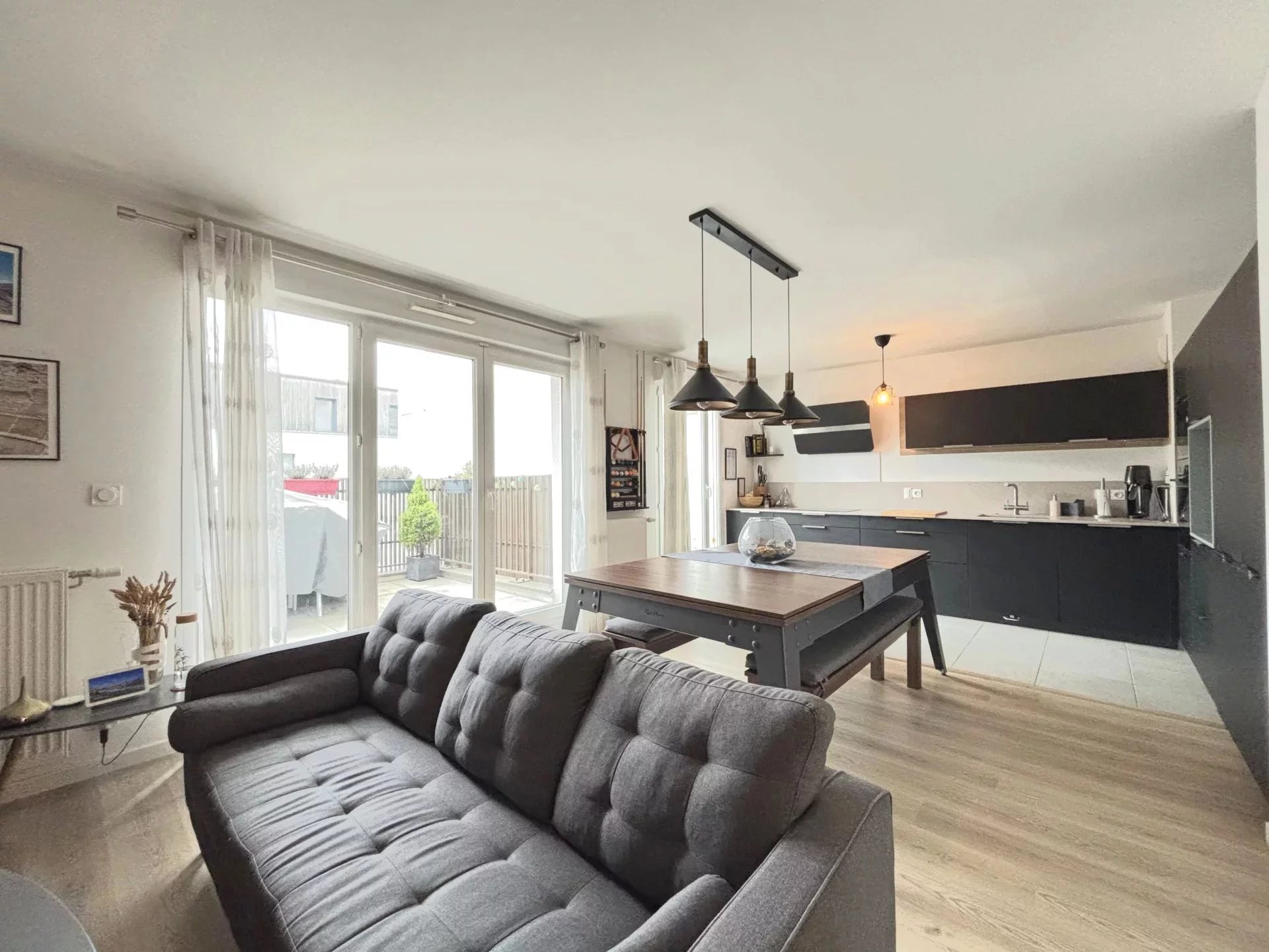 Entrée avec placards, séjour et cuisine ouverte haut de gamme Schmidt le tout donnant sur une terrasse exposée Ouest.